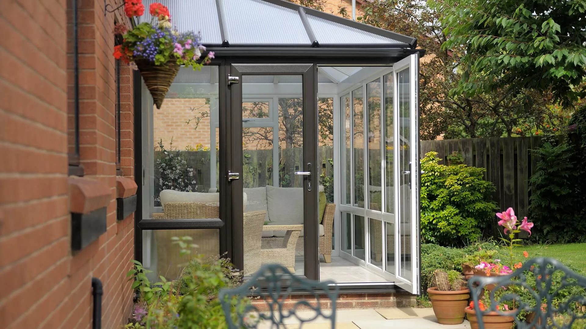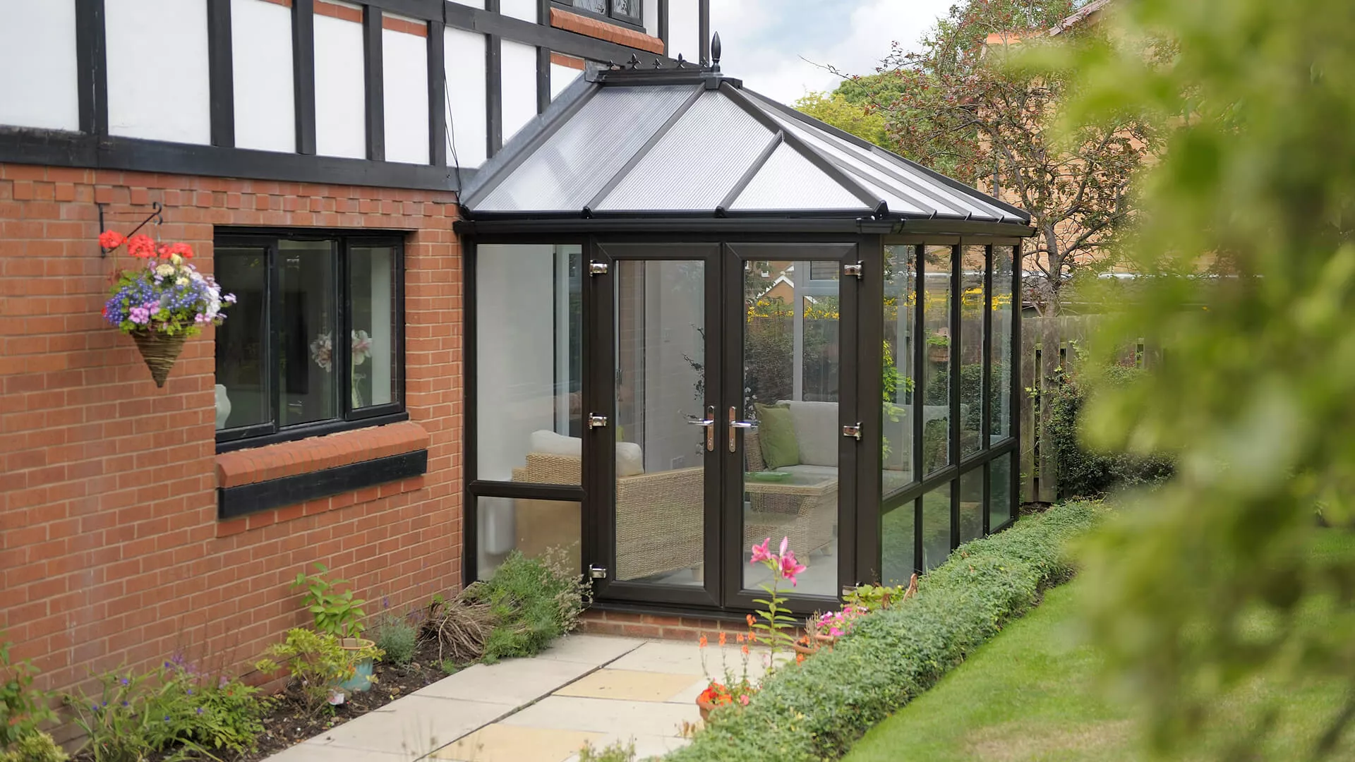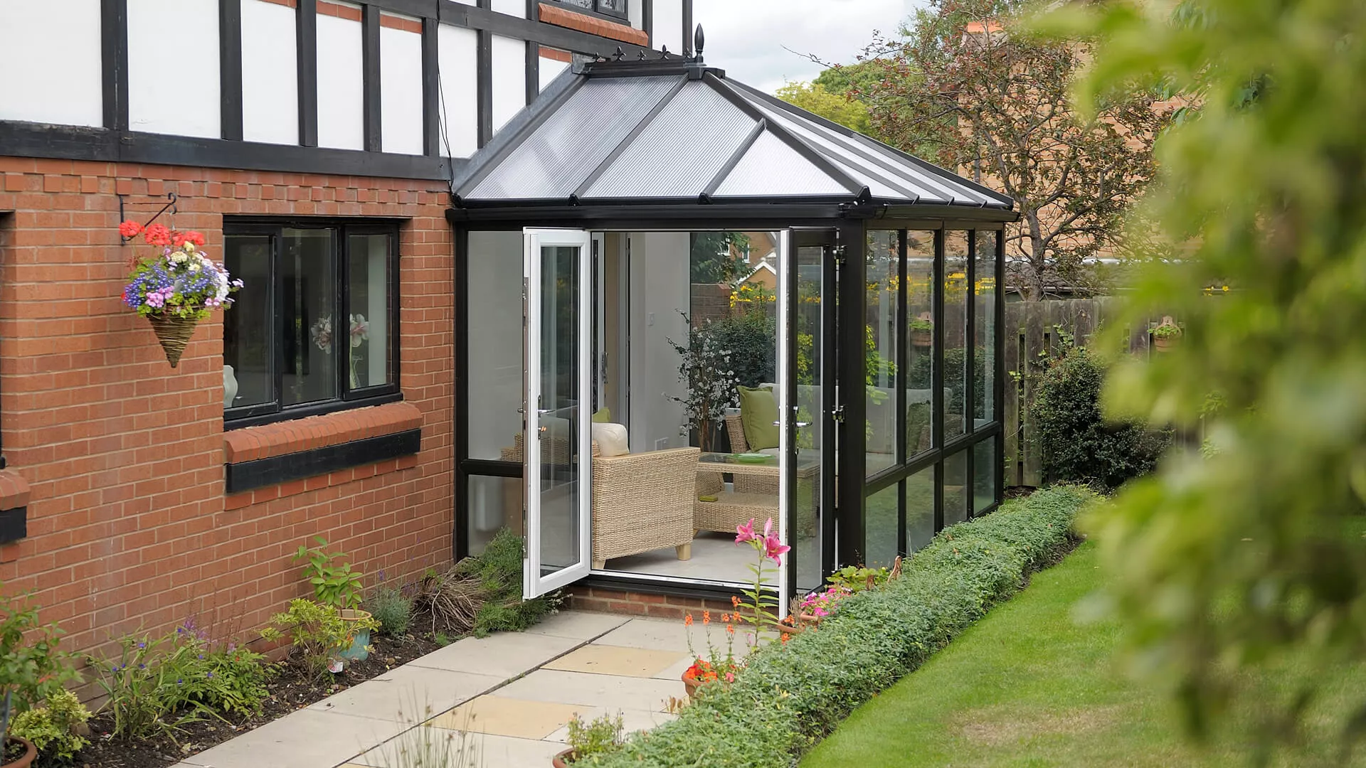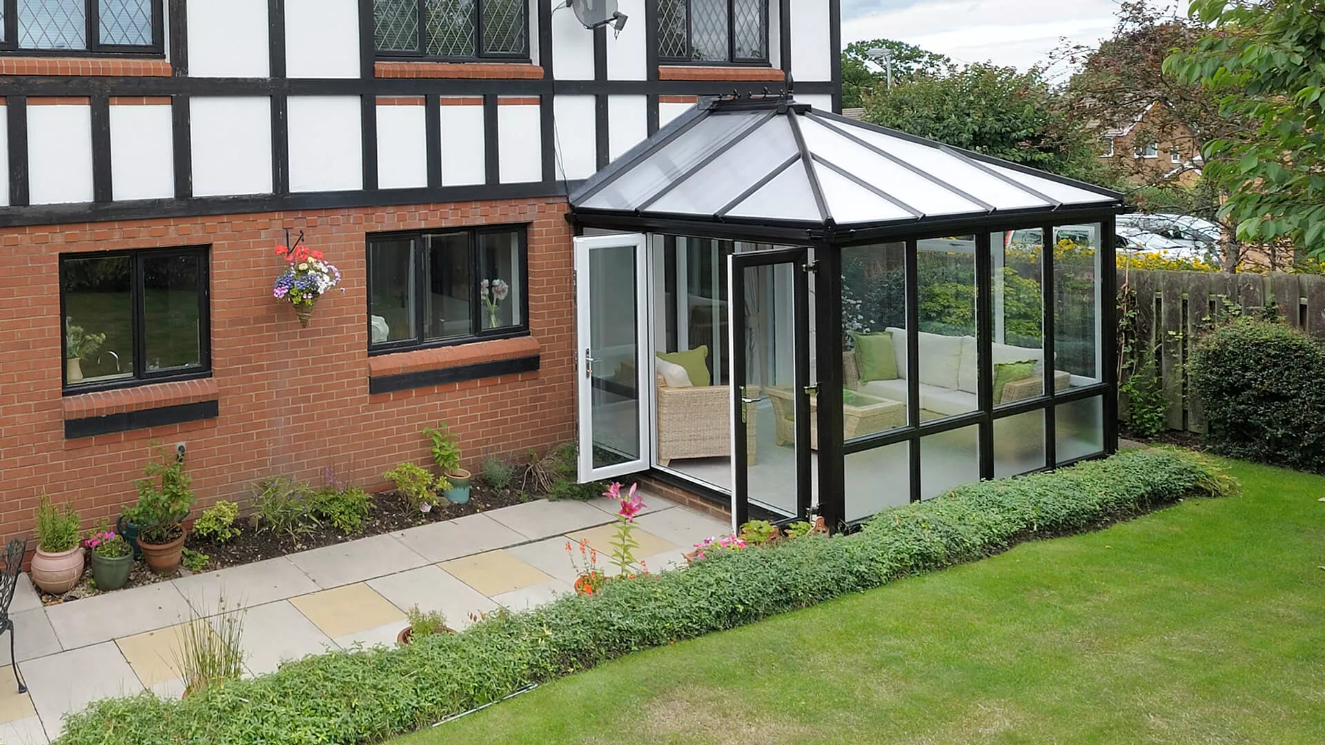 When it came to picking a roof covering the soon-to-be conservatory owners chose a polycarbonate roof. Their reasoning for this was because a polycarbonate roof is known for deflecting away excess warmth and cold. French doors are also present so that they can exit their conservatory for the garden in the most glamorous means – the handles attached to the doors have been meticulously crafted. There was only one appropriate colour in the minds of the occupants for their new extension and that was a brilliant, bold black. They did however decide to provide a contrast by having a traditional white applied to the inside of the frames. It’s black and white that this installation has worked a treat.