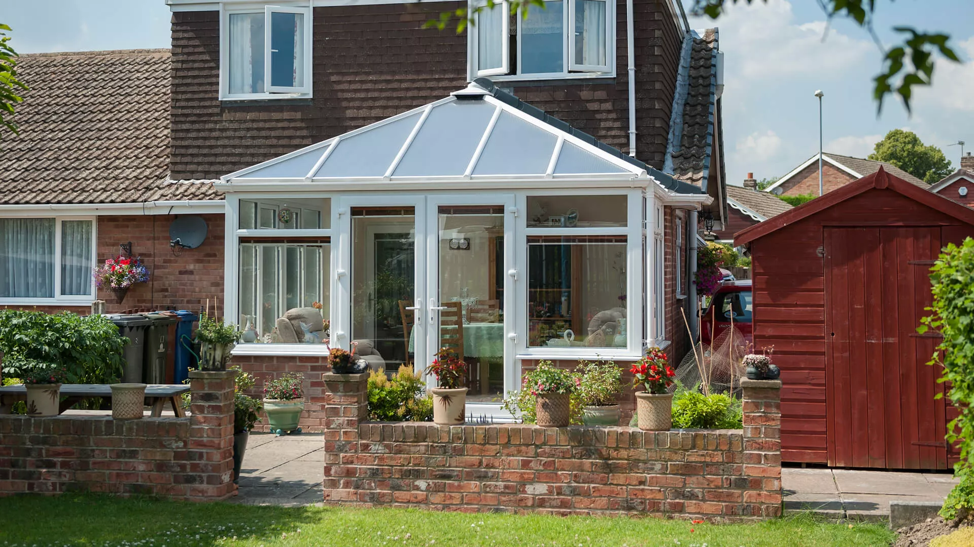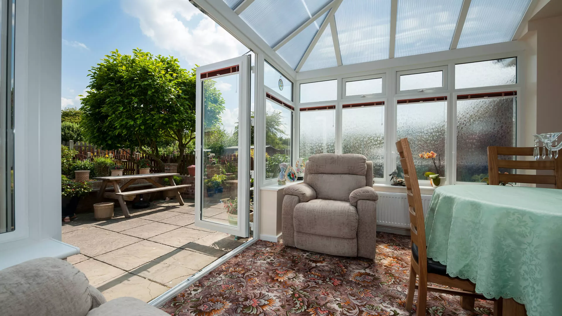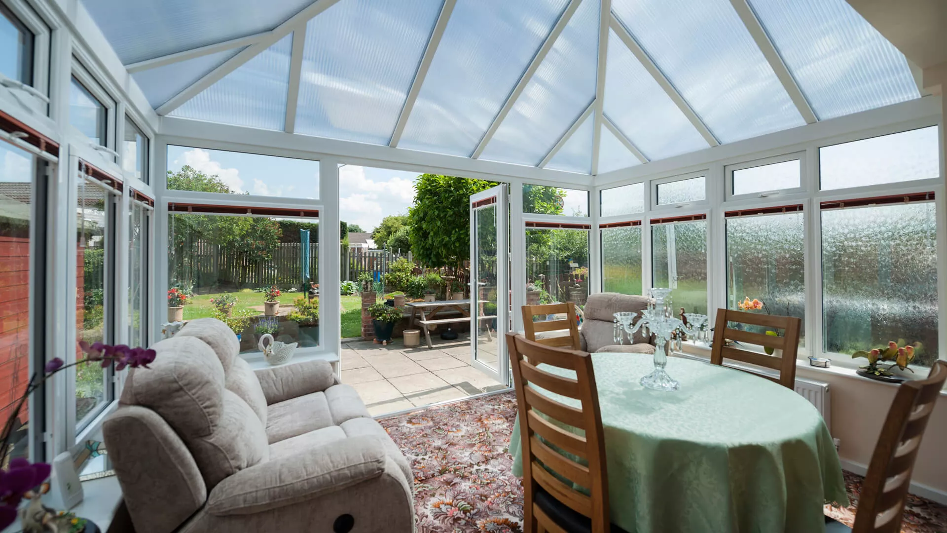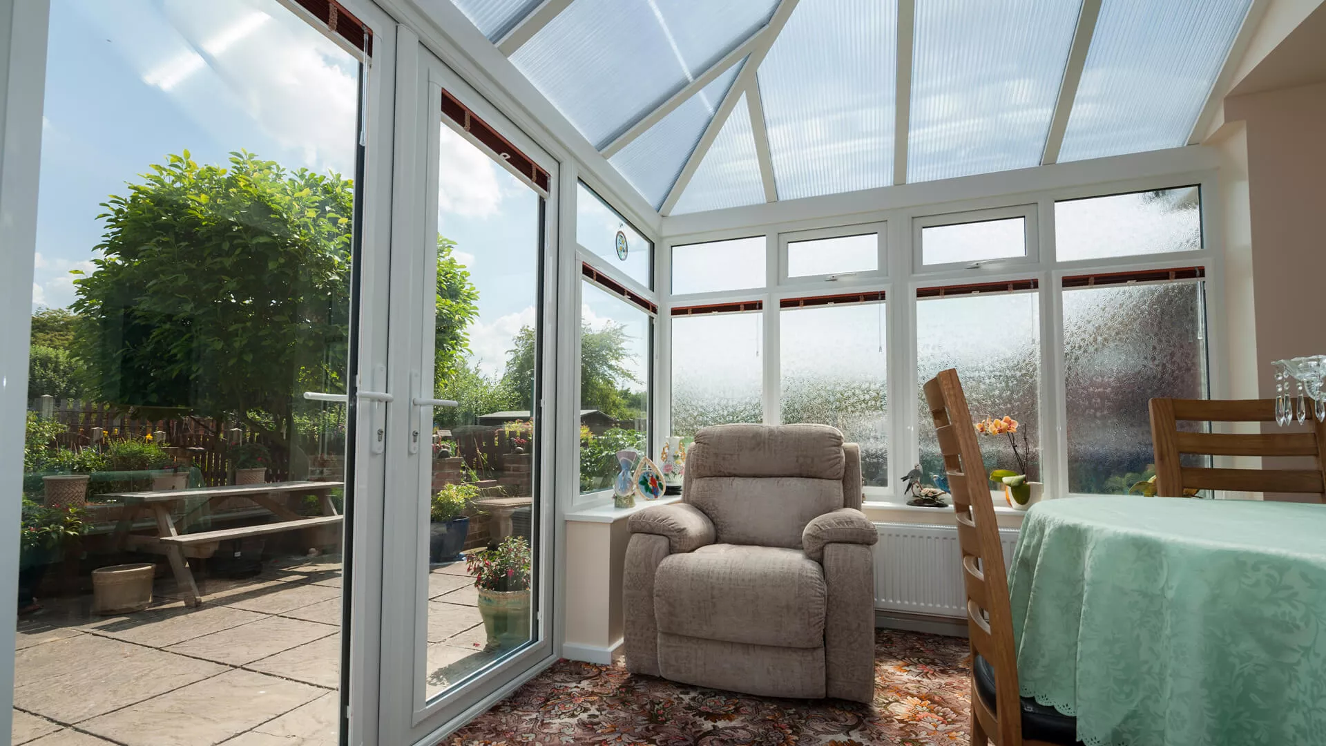 It has a polycarbonate roof covering, so there’s no possibility of any harmful UV rays entering into the interior. The window blinds can always be drawn if the internal temperature rises and the occupants want to cool things down a little. They’ll also provide privacy similar to the frosted patterned glass which will obscure what people can see when they’re trying to look into the conservatory from afar. All-year round protection is assured due to the resilience of the glass, framework and the fact that the French doors contain an ABS snap secure euro cylinder lock. This locking system is one of the strongest you can get. A lasting love of home has been reawakened purely because of the majesty of a conservatory.
