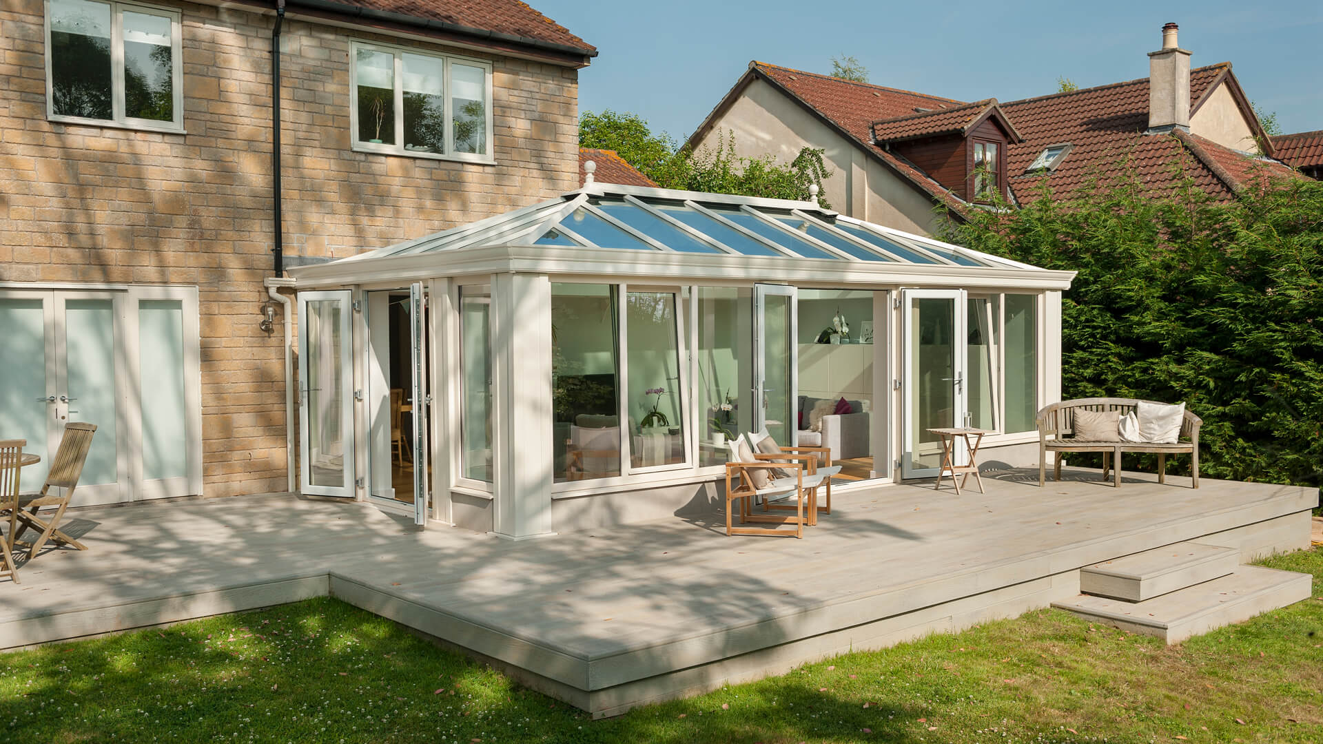 The Loggia has only been around for a few years, but it has already managed to capture the imagination of thousands of UK homeowners. We anticipate it will have the exact same effect on you. It gives you the same light and spaciousness that you would expect from a traditional glass conservatory, whilst also offering the thermal efficiency you get from a brick-built extension. A classic white finish was selected for the entirety of this design and it looks the business after application onto the ornate corner columns. The solar controlled glass roof regulates the internal temperature and entices light inwards.
