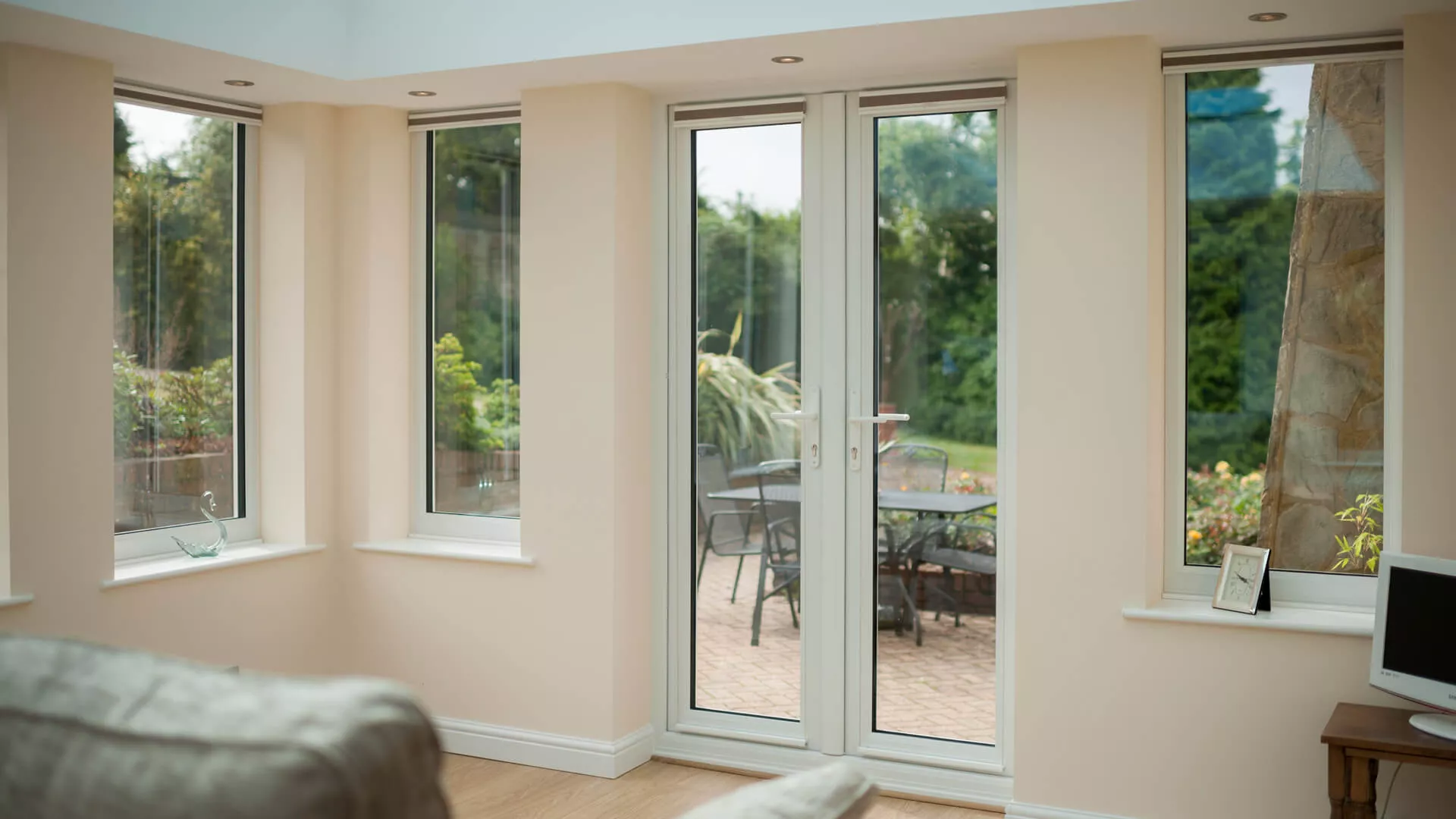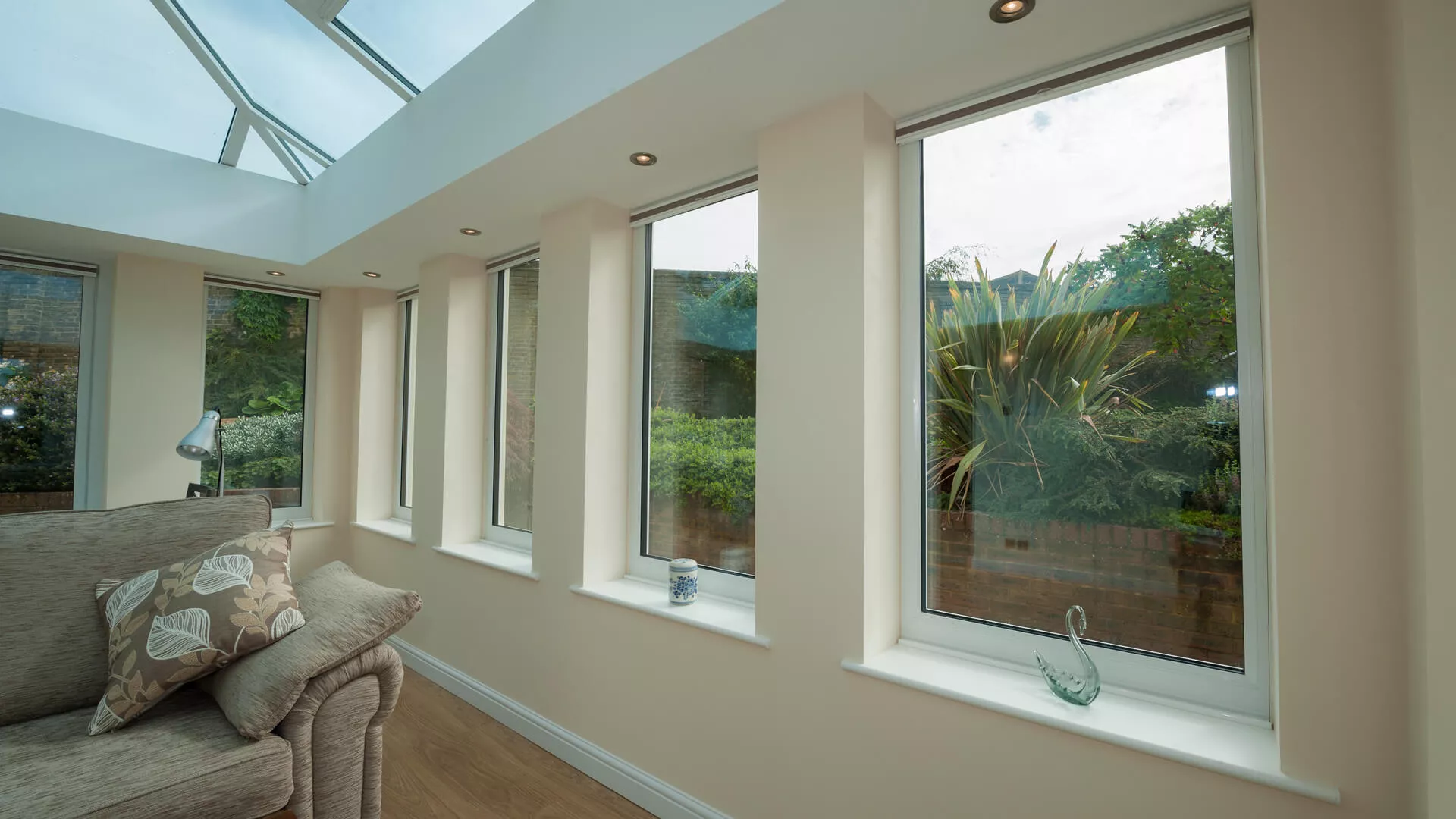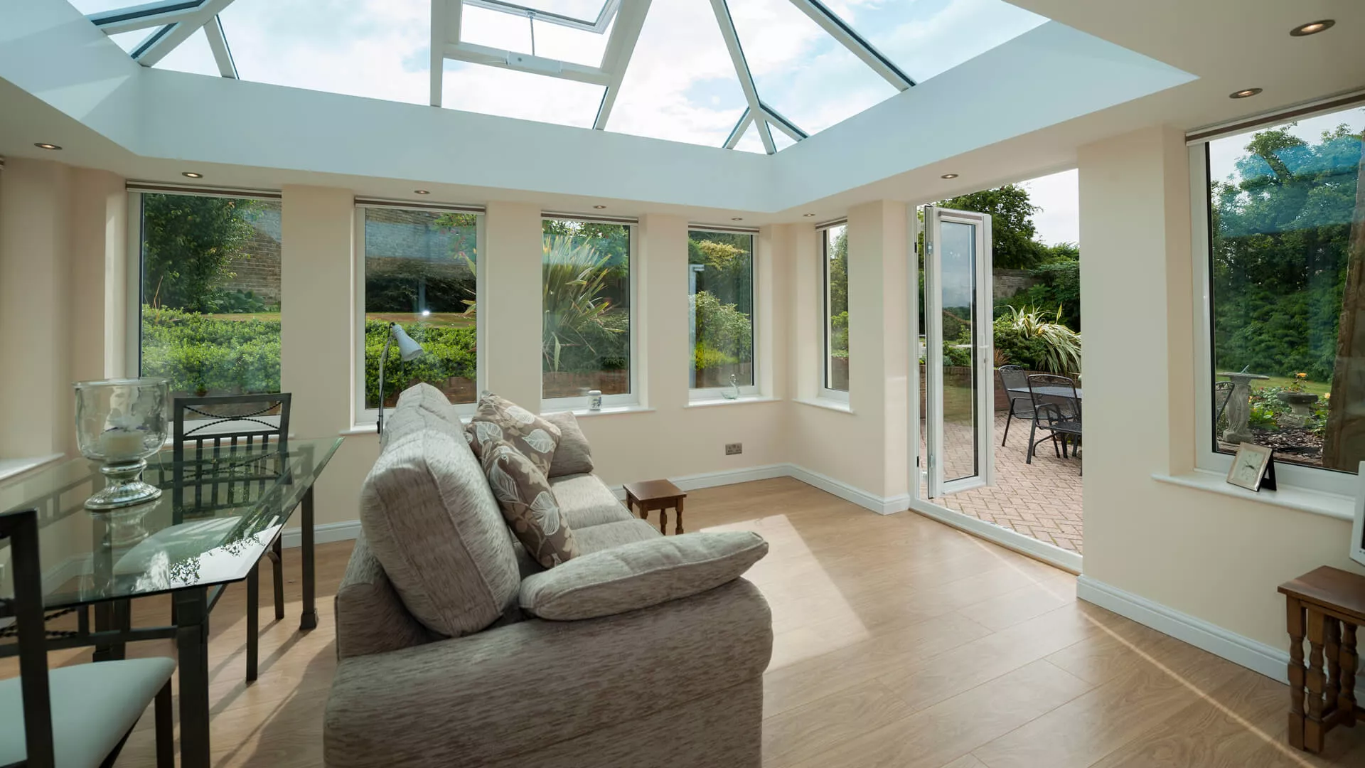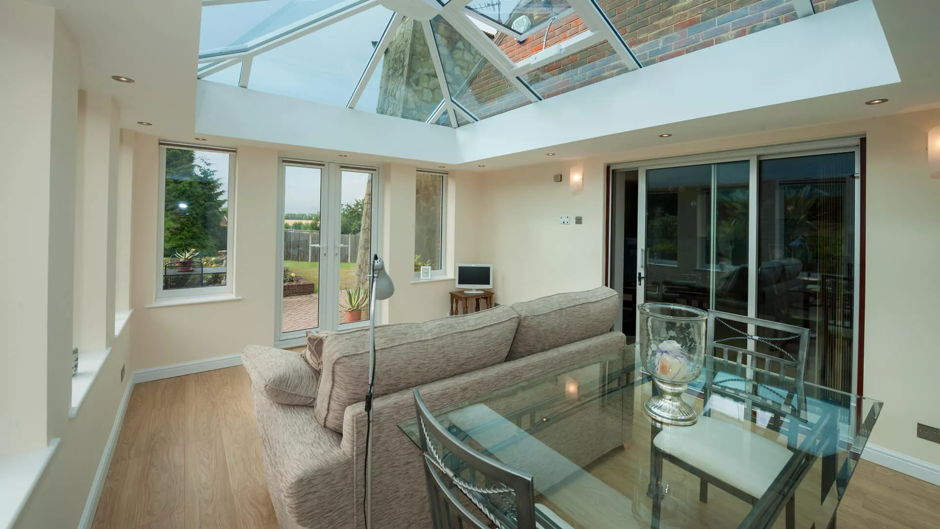 A suite has been purposely placed opposite to the white UPVC French doors so that the view through them can be fully appreciated. The occupants can also quickly rise from a seated position to venture outside onto the patio. Far from being a daytime only setting, the Loggia is also specially configured for night time living as downlighters have been positioned and connected up in the internal perimeter ceiling. One of the most striking aspects of the design though is the insulated corner columns – the detail is quite breath-taking and something you’d never tire of admiring. Glazed home extensions don’t get any more impressive than this.