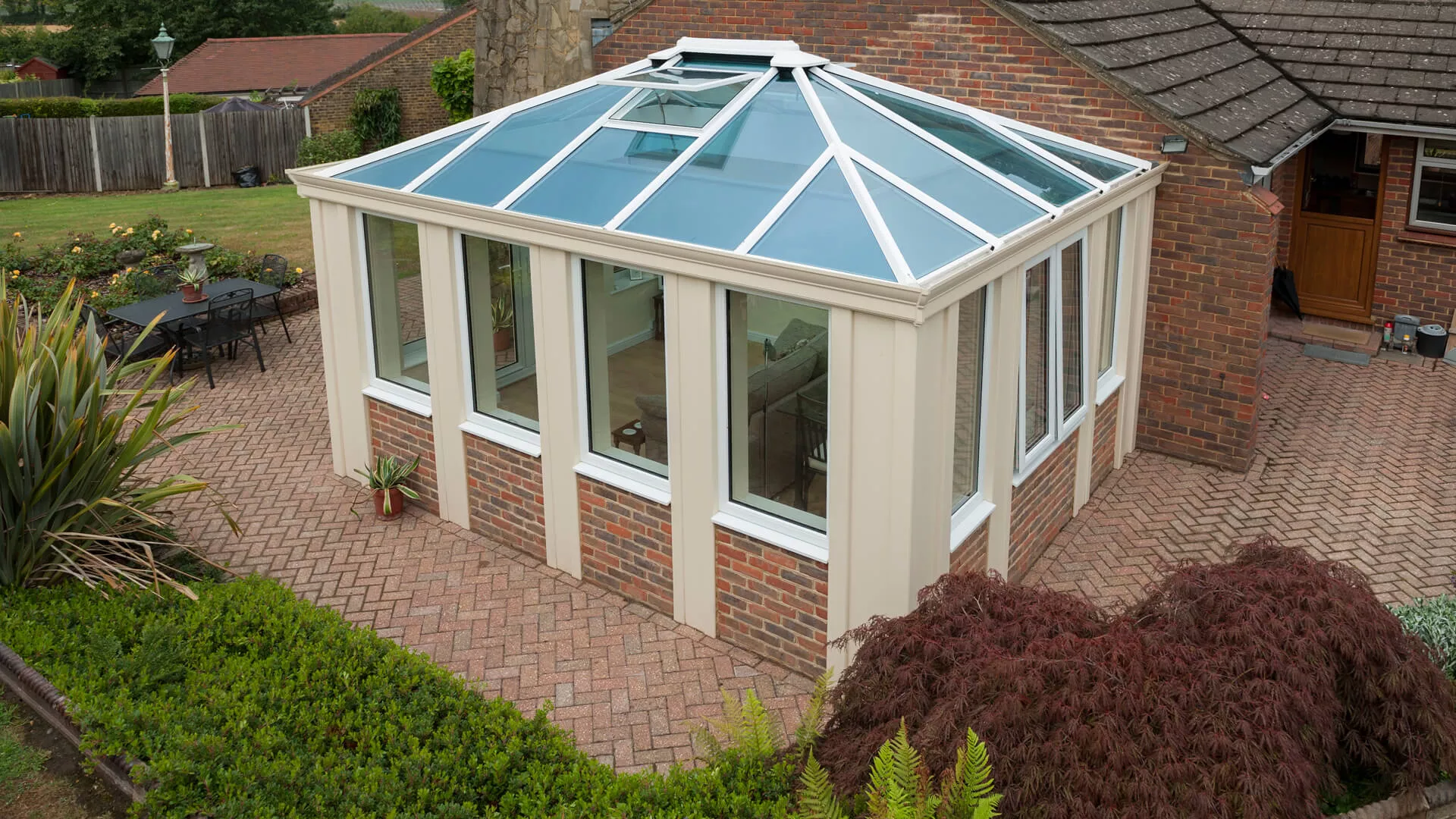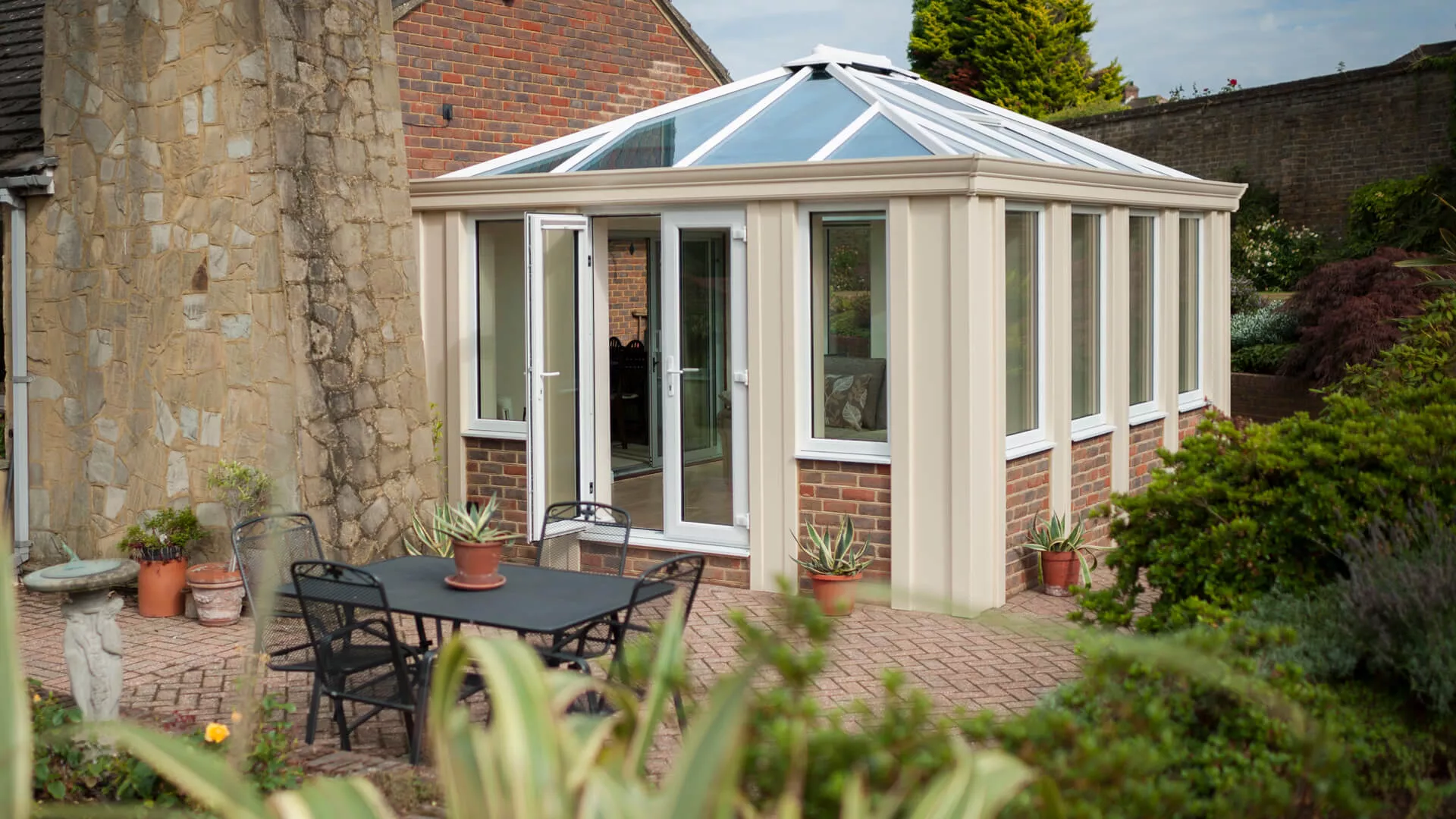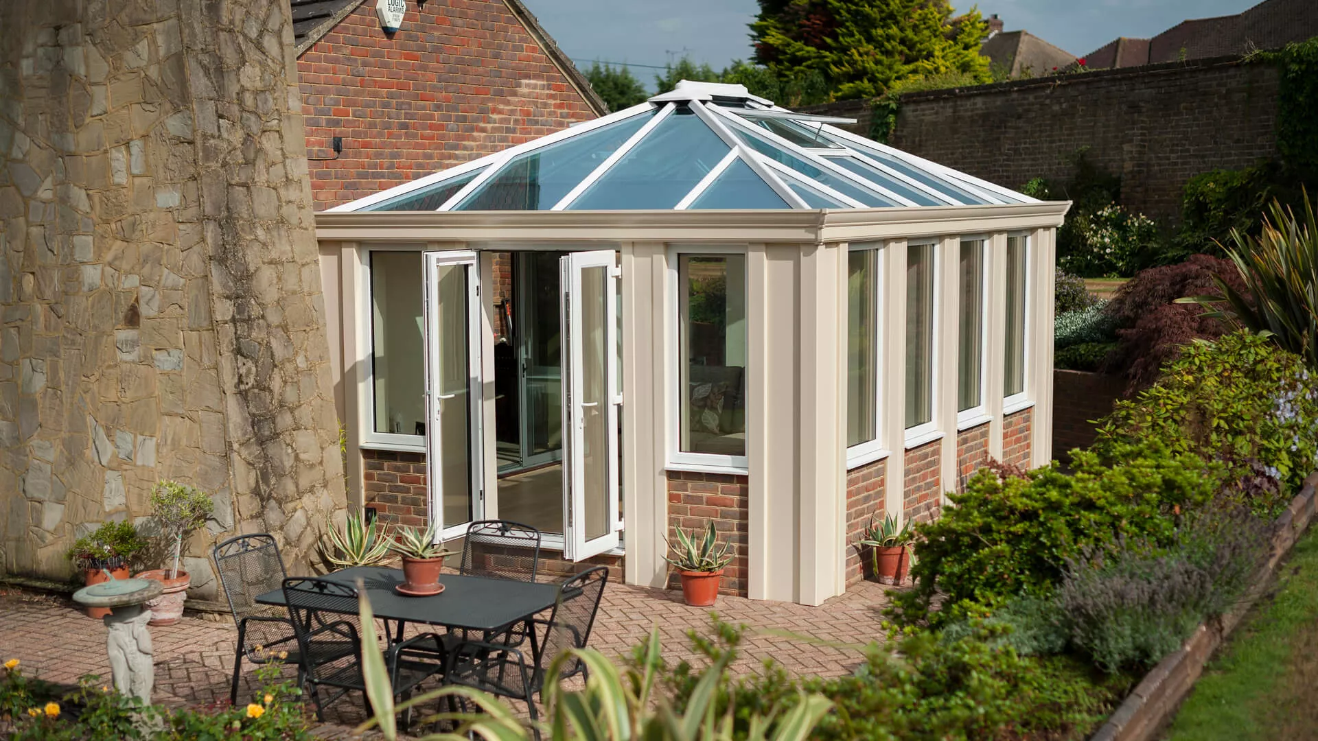 When it was first unveiled the Loggia caused a storm and led to a deluge of requests for arguably the most exotic home extension ever created. Bridging the gap between a conservatory and conventional home extension, this Loggia boasts a pleasing pure cream finish and was built with the utilisation of a dwarf wall. Twin manual opening vents have been incorporated into the all-encompassing glass roof so that cool air can enter into the space and circulate its way around in warm conditions. Suitable thermal comfort will be assured though whatever the weather outside.