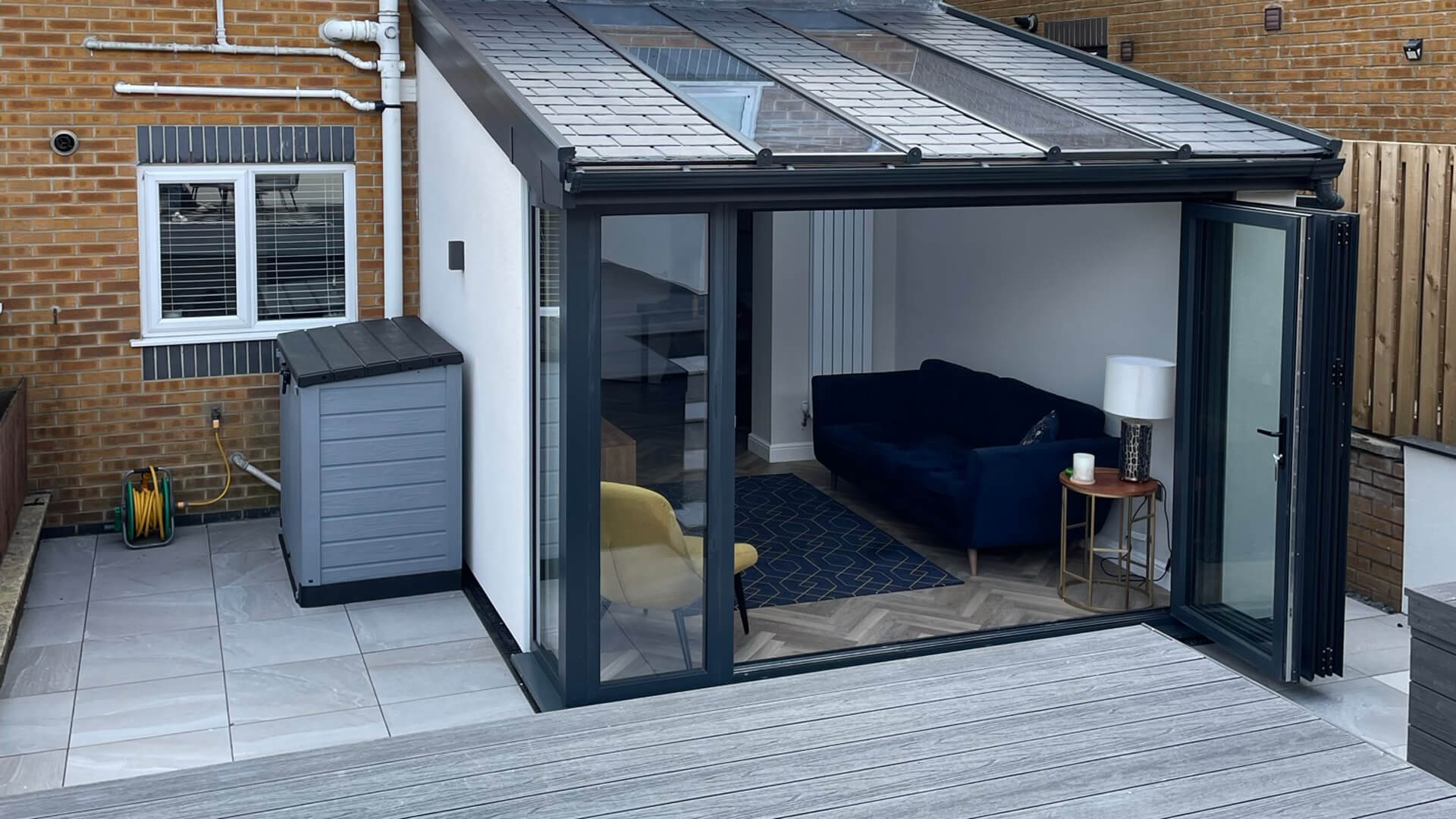 Swapping the old polycarbonate roof for a tiled roof with glazed panels was the key to creating a warmer, more comfortable room that felt like a proper extension. They also chose to remove the old French doors and replace them with modern aluminium bi-folding doors that allowed them to open up the whole back wall into the garden space outside. Solid walls on either side gave them space to add furniture and finishing touches without losing too much light.
